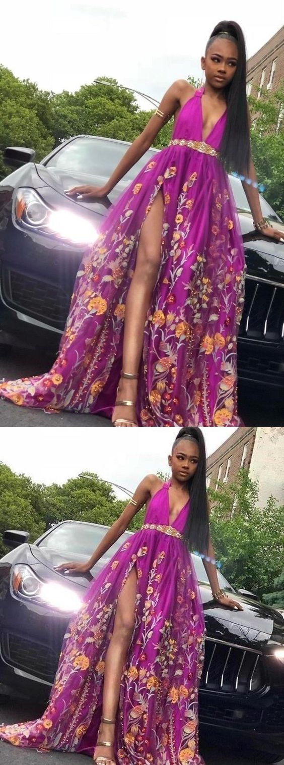 A-Linie, tiefer V-Ausschnitt, hoher Schlitz, lila Tüll, Ballkleider, lange Abendkleider, cg8981
