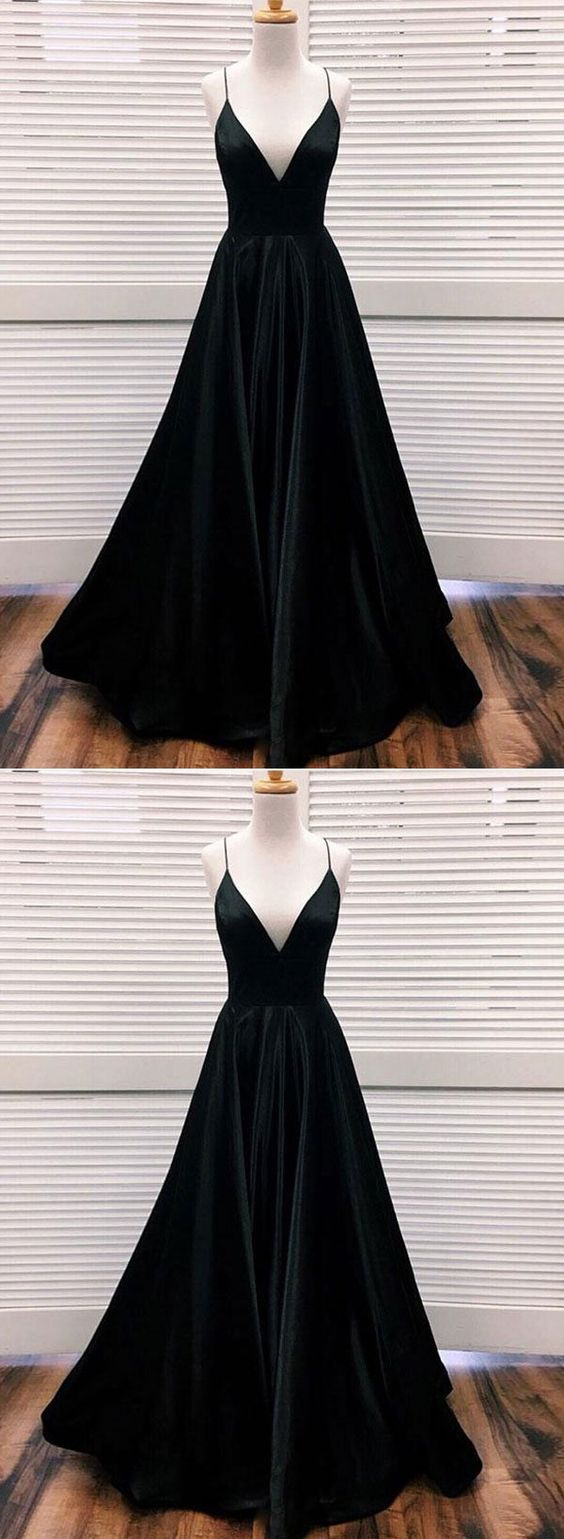 Schwarzes langes Ballkleid aus Satin mit V-Ausschnitt, schwarzes Abendkleid cg676
