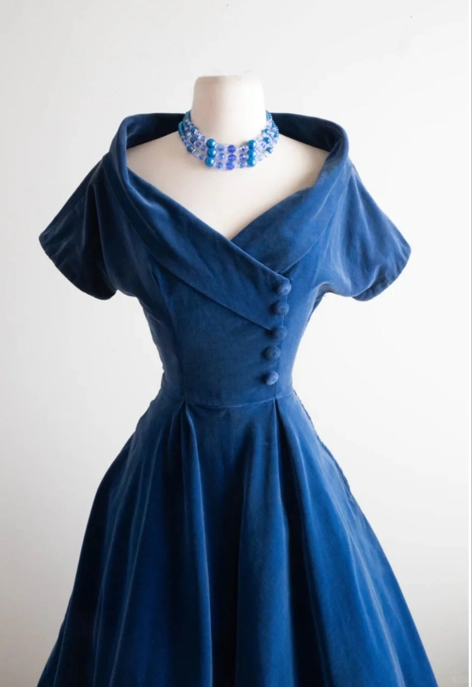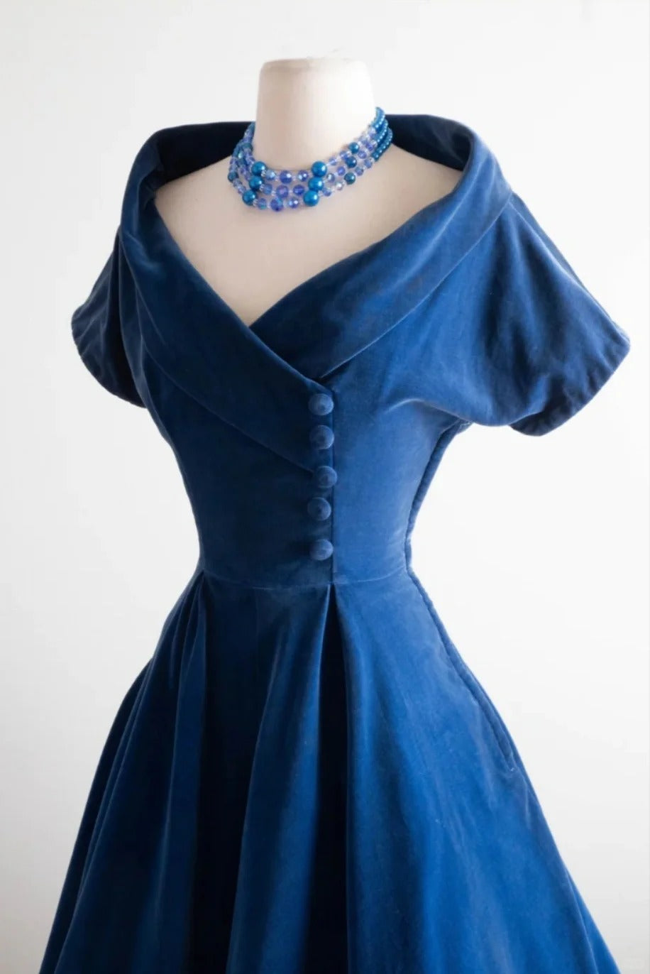 Blaues Samt-Vintage-Kleid, Heimkehrkleid, kurzes Ballkleid, Partykleid, cg26048