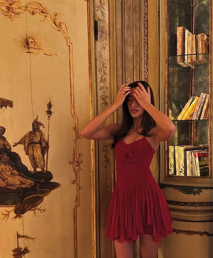 Burgunderrotes, elegantes, kurzes Ballkleid mit Spaghettiträgern und Blumen, Plissee, formelles Kleid, Abendkleid cg25875