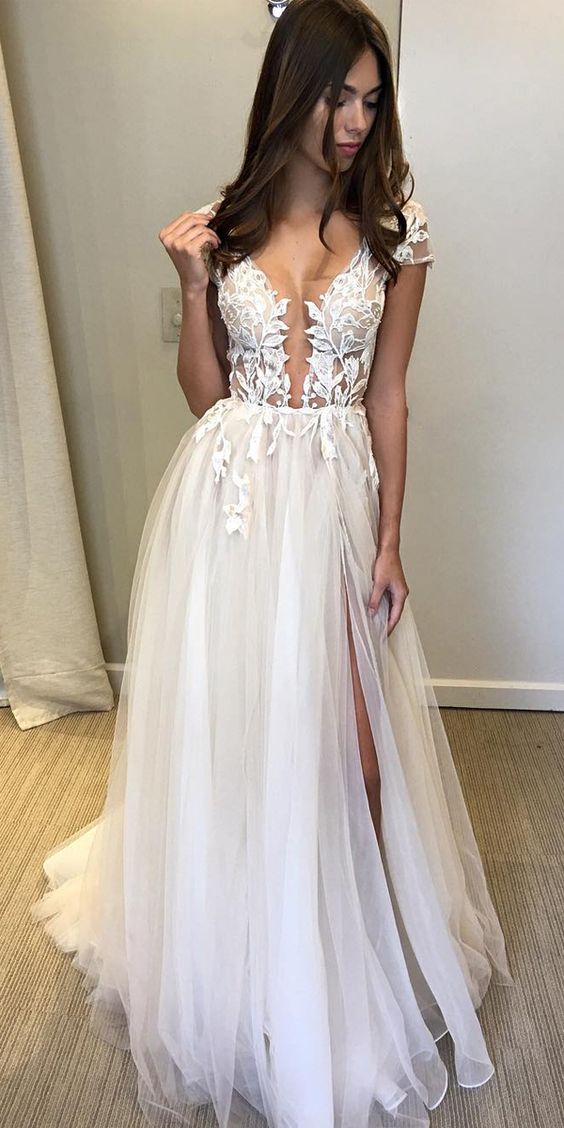 Flügelärmeln tiefem V-Ausschnitt Ballkleid mit Applikationen Sexy Split Brautkleider cg8006