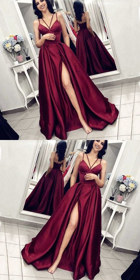 Schickes Burgunderrotes Spaghettiträger-Kleid mit Seitenschlitz und rückenfreiem langen Abendkleid cg458