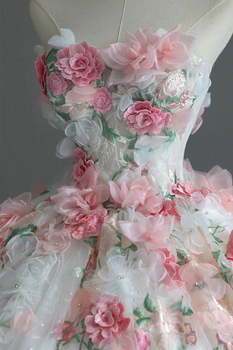 Flower Fairy Weiße Spitze Applikationen Blume Brautkleid 2025 Ballkleid Trägerlos Ärmellos Rückenfrei Hofschleppe Brautkleid cg25904