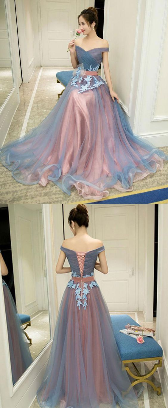 Graublaues schulterfreies langes Ballkleid aus Tüll, graublaues Abendkleid cg467