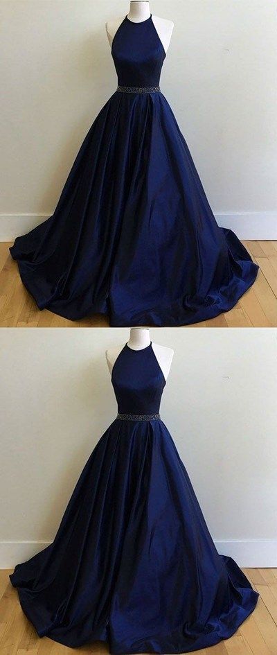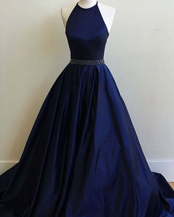 Neckholder-Ballkleid aus marineblauem Satin mit Gürtel, langes, schlichtes Abendkleid cg690