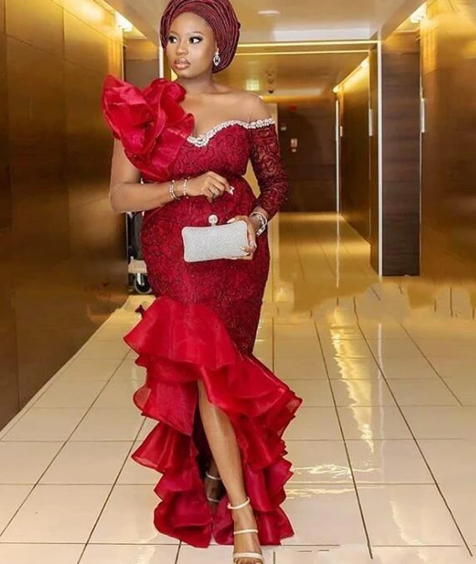 Meerjungfrau Abendkleider Spitze Applikationen Formales Ballkleid Afrikanische Organza Rüschen Eine Schulter Langarm Abendkleid cg13403