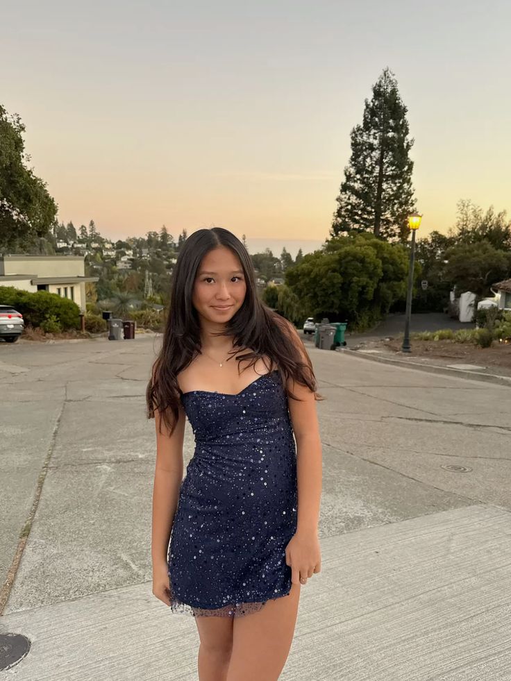 Marineblaues, kurzes, glänzendes Partykleid mit Spaghettiträgern, Heimkehrkleid, cg25662