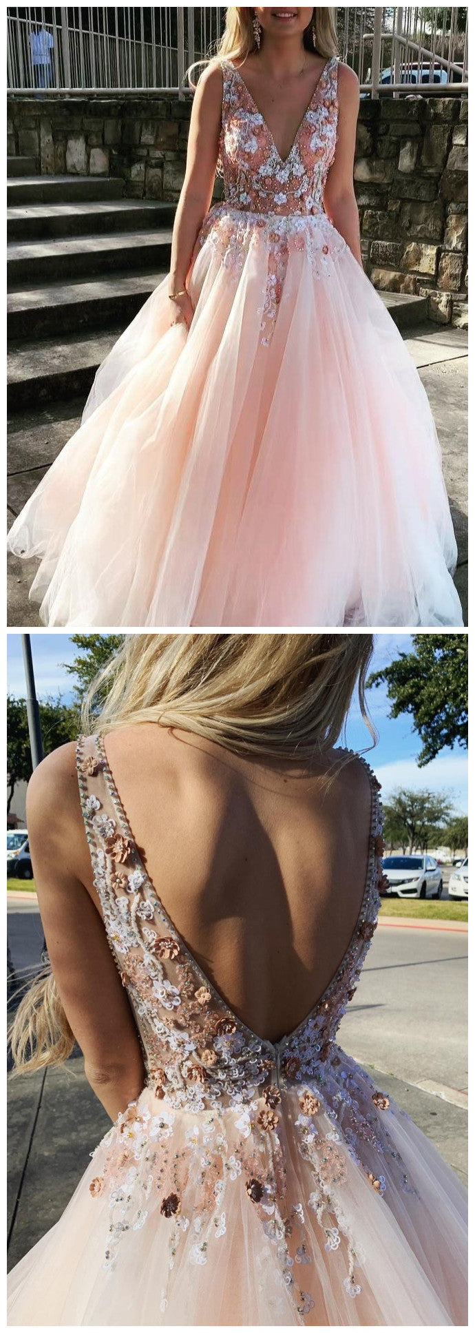 Sexy rückenfreies Ballkleid Perlenrosa Tüll V-Ausschnitt Applikationen Abschlusskleid cg1166