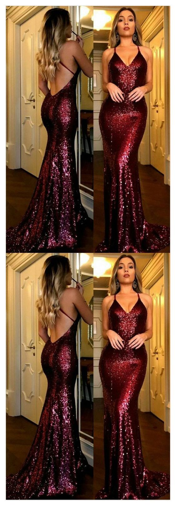 Sexy Neckholder V-Ausschnitt Rückenfrei Pailletten Burgunderrot Ballkleider Lange Abendkleider cg15963