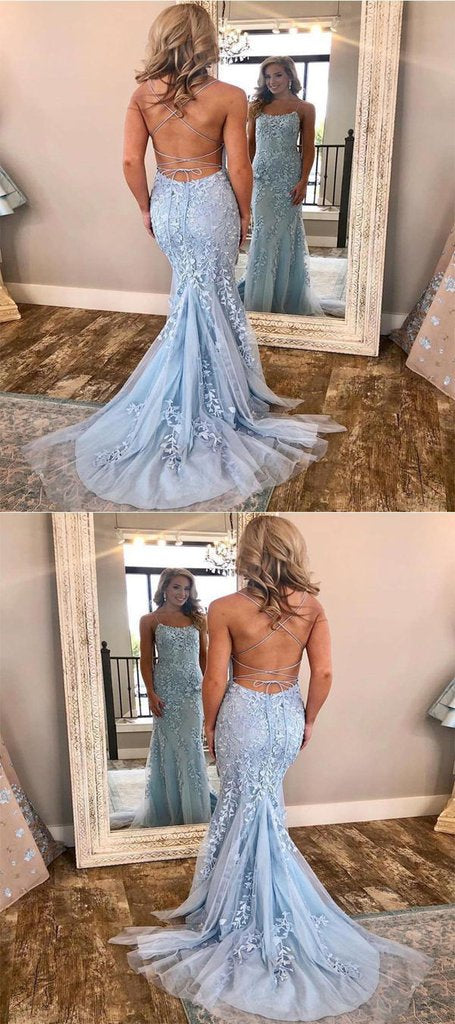 Sexy Meerjungfrau Spitze Blau Rückenfrei Lange Ballkleider cg611