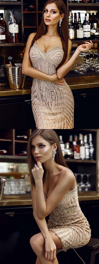 Etuikleid mit Spaghettiträgern, Champagner, kurz, eng, Heimkehrkleid, cg662