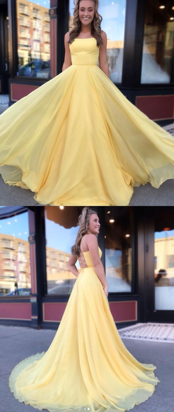 Einfaches gelbes Chiffon-Langballkleid, gelbes Abendkleid cg681