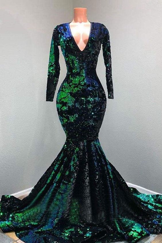 Glitzernde Pailletten Langarm V-Ausschnitt Meerjungfrau Ballkleider cg18922