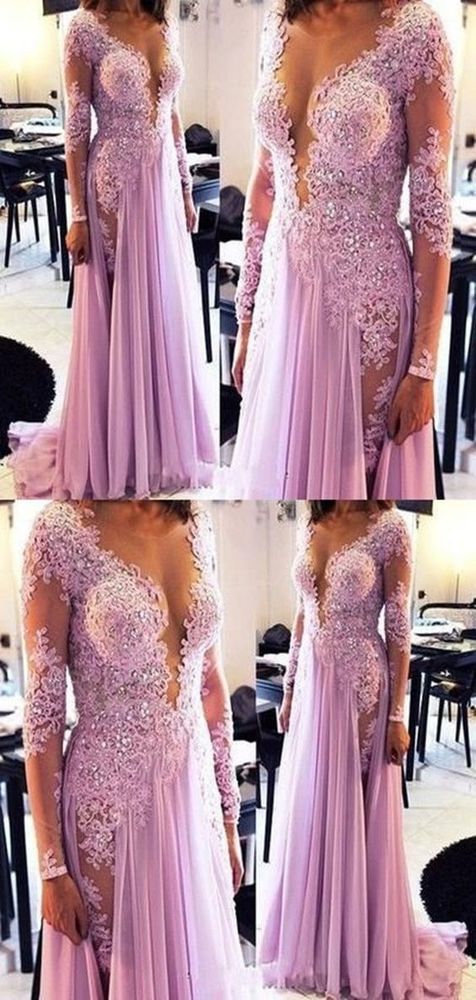 2019 Long Sleeve V neck Chiffon Appliques Evening Dress, Formal Prom Dress, Sexy Evening Gown cg4320